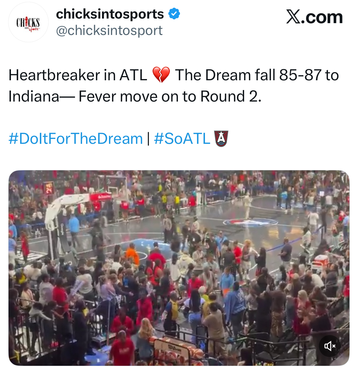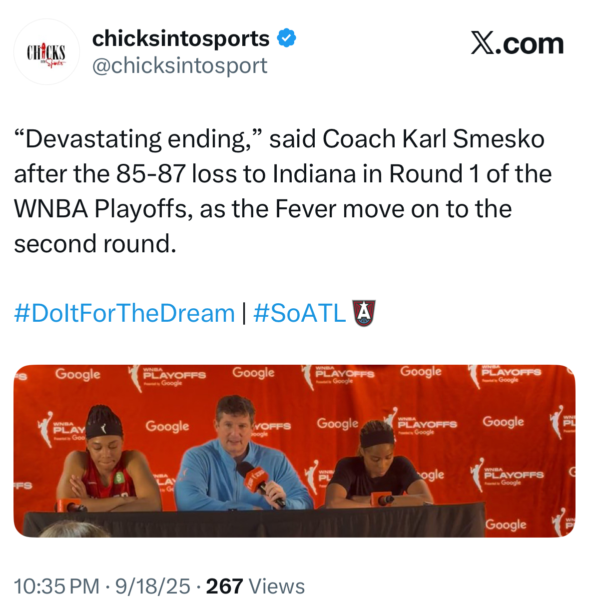 In the final seconds, Sims was fouled and went to the line with Atlanta trailing by two. She sank the first free throw but missed the second, leaving the Dream down 87–85. Brionna Jones got one last look at the buzzer, but her three-pointer from the top of the arc rimmed out. The Dream fell 85–87 to Indiana, as the Fever advance to Round 2 of the WNBA Playoffs. Reflecting on the game, Coach Karl Smesko called it a “devastating ending” to what had been a season of progress.