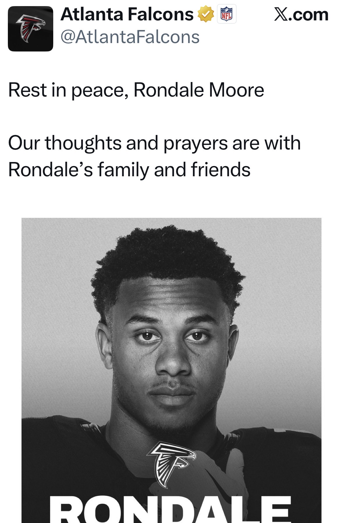 Following news of his death, the Atlanta Falcons released a statement on X expressing their condolences: “Rest in peace, Rondale Moore. Our thoughts and prayers are with Rondale’s family and friends.”